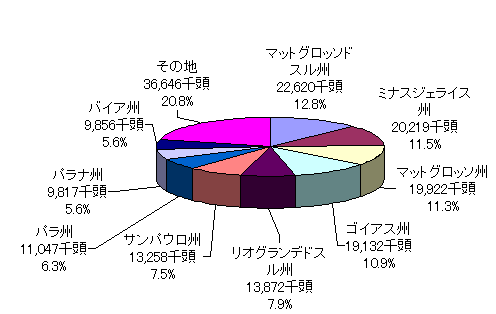 2001年の牛飼養頭数(乳牛を含む)は、1億8千万頭でうち肉用牛が約7割を 占める。肉用牛のうち約1億頭がゼブーおよび少数のヨーロッパ品種とされてい る。 牛の飼養頭数を地域別に見ると、中西部、南東部、南部に全体の7割以上が集 中している。飼養頭数が最も多い州は、中西部のマットグロッソドスル州(シェ ア13%)で、牧草を主体とした肉牛生産が盛んである。次いで多いのはミナスジ ェライス州(12%)である。