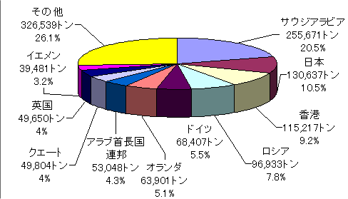 鶏肉輸出は、97年のアジア経済危機などの影響で、98年に輸出量は前年を下 回ったが、レアル安による価格競争力の向上、トウモロコシ価格の下落などか ら、開発商工省貿易局の統計によると2001年の鶏肉輸出量は、前年比38.4%増の 124万9千トンとなった。形態別に見ると、丸鶏が58万トン、パーツが66万9千ト ンとなった。国別では、丸鶏の主要市場であるサウジアラビアが25万6千トンと 最も多く、次いでパーツの主要市場である日本が13万1千トンと続く。1人1年当 たりの鶏肉消費量は、牛肉と比較し安価であることや、消費者の健康志向の高ま りなどから、2001年は36キログラムとなり、92年に比べ2.3倍となった。表4 鶏肉需給の推移