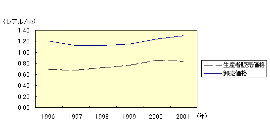 2000年のブロイラーの生産者販売価格は、輸出量の増加などにより、前年比 11.7%高のキログラム当たり0.86レアルとなったが、2001年もこの傾向が続い たことなどから前年と同水準のキログラム当たり0.84レアルとなった。また、 ブロイラーの丸鶏卸売価格は前年を4.8%上回るキログラム当たり1.30レアルと なった。