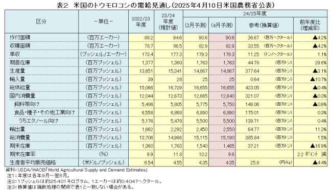 USDA/WAOBは同日、2024/25年度(9月〜翌8月)の米国のトウモロコシ需給見通しを公表した(表2)。