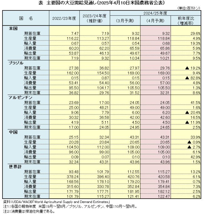 米国農務省世界農業観測ボード(USDA/WAOB)および米国農務省海外農業局(USDA/FAS)は2025年4月10日、2024/25年度の世界の大豆需給予測値を更新した(表)。