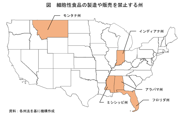 細胞性食品の普及を推進する非営利団体のグッドフードインスティテュート(GFI)によると、細胞性食品の販売などを禁止する州法は、24年に12の州で審議されたものの、同年中に成立・施行された州はフロリダ州とアラバマ州