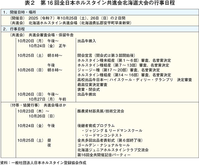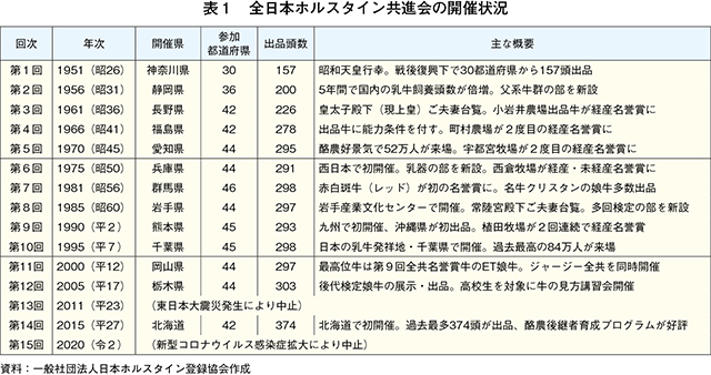 表1には、過去の全共開催状況を示した。第2次世界大戦後の復興も間もない1951年に神奈川県平塚市で、昭和天皇の行幸を仰いで第1回全共を開催して以来、全共は、国内の酪農主要道県などで計13回開催され、70年あまりの歴史を持つ。61年の第3回長野大会では当時の皇太子殿下(現上皇)ご夫妻の台覧の下、小岩井農場出品牛が経産名誉賞に輝いた。70年の第5回愛知大会では、酪農好景気のさなか、全国から52万人が来場し、北海道・宇都宮牧場が2度目の経産名誉賞を獲得した。