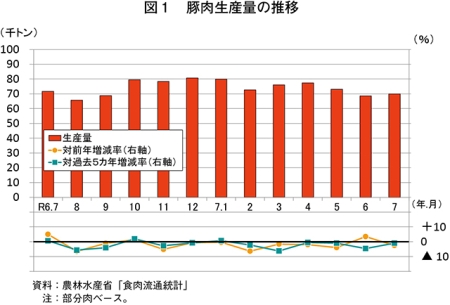 令和7年7月の豚肉生産量は、6万9871トン(前年同月比2.5%減)と前年同月をわずかに下回った(図1)。