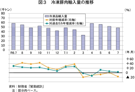 7月の輸入量について、冷蔵品は、米国産の価格が上昇する中、価格優位性が生じたカナダ産が増加したことや、高騰する国産豚肉から需要がシフトした影響などから、3万4169トン(前年同月比22.8%増)と前年同月を大幅に上回った(図2)。冷凍品は、国内の輸入品在庫が多いことや、前年の輸入量が多かったことなどから、4万8516トン(同16.8%減)と前年同月を大幅に下回った(図3)。この結果、輸入量の合計(注1)では、8万2687トン(同4.0%減)と前年同月をやや下回った。