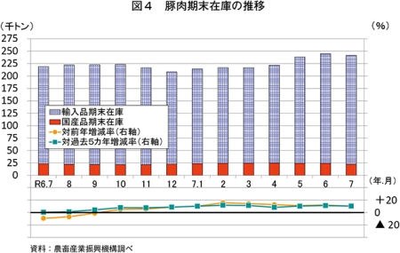 7月の推定期末在庫は、24万1504トン(前年同月比10.4%増)と前年同月をかなりの程度上回った(図4)。このうち、輸入品は、21万9105トン(同12.1%増)と前年同月をかなり大きく上回った。