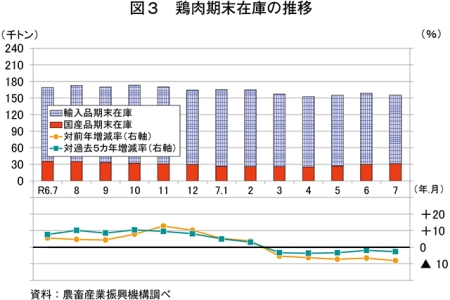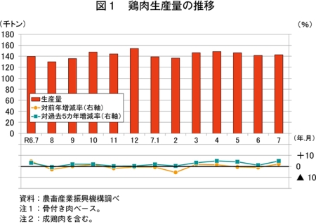 令和7年7月の鶏肉生産量は、14万2858トン(前年同月比2.2%増)と前年同月をわずかに上回った(図1)。