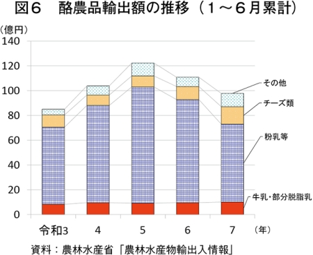 令和7年8月4日に農林水産省が発表した「農林水産物輸出入情報(令和7年6月分)」によると、本年上期(1〜6月)における酪農品の輸出量は、9672トン(前年同期比3.5%減)と前年同期をやや下回り、輸出額は97億7977万円(同11.8%減)とかなり大きく下回った(図6)。