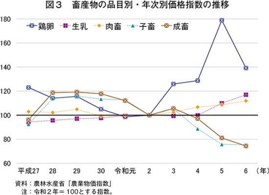 農産物のうち畜産物の価格指数を見ると、6年は、鶏卵の価格が特に年前半に低下したことなどから、前年に比べ2.5%低下の110.6となった(図2、3)。