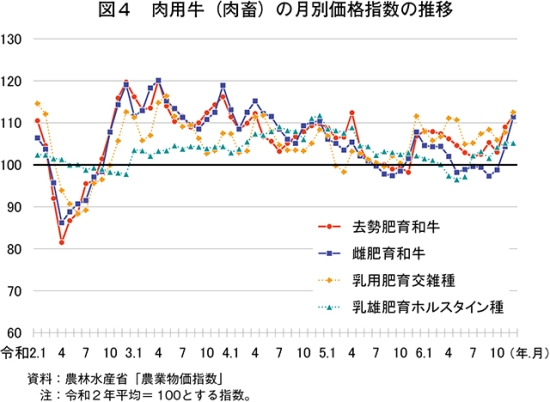 畜産物のうち肉用牛(肉畜)を見ると、近年の物価の上昇による消費者の生活防衛意識の高まりなどの影響により、品種によっては100を下回る月があったものの、去勢肥育和牛および乳用肥育交雑種は年間を通して100を上回って推移した。年平均では、去勢肥育和牛は同2.3%上昇の105.9、乳用肥育交雑種は同5.3%上昇の107.8、雌肥育和牛は同0.3%低下の101.9、乳雄肥育ホルスタイン種は同3.6%低下の101.2となった(図4)。