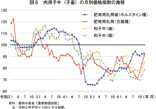 肉用子牛(子畜)を見ると、6年は、和牛枝肉価格の低迷や配合飼料価格が高水準にあることなどを背景に、肥育農家の子牛購買意欲が減退したことなどから下落傾向が継続し、前年に続き、全品種がすべての月で100を下回った。年平均では、和子牛(雌)は同5.3%低下の75.3、和子牛(雄)は同3.4%低下の82.4、肥育用乳用(交雑種)は同0.4%低下の81.1となった一方、肥育用乳用雄(ホルスタイン種)は国産牛肉の需要の高まりや生産量の減少などを背景に同18.2%上昇の86.2となった(図5)。