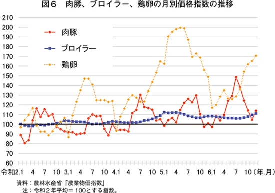 鶏卵を見ると、6年は、高病原性鳥インフルエンザ(以下「HPAI」という)の影響で加工用需要が減少していたが、年後半は猛暑による供給量の一時的な減少やHPAIの発生などにより上昇した。前年に続きすべての月で100を上回ったものの、年平均では、同22.2%低下の139.2となった。