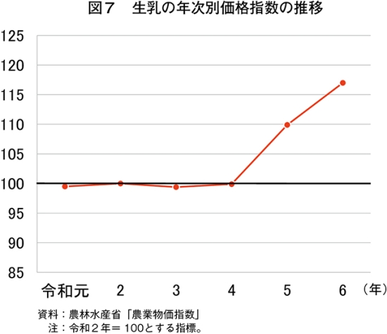 生乳は昨年から7.1ポイント上昇して117.0となり、年次平均としては初めて110を超えた。これは、令和4年11月および5年8月に行われた飲用など向け乳価の値上げや、5年4月の乳製品向け乳価の値上げなどによるものである。6年は3月を除いて115を超えて推移した(図7)。