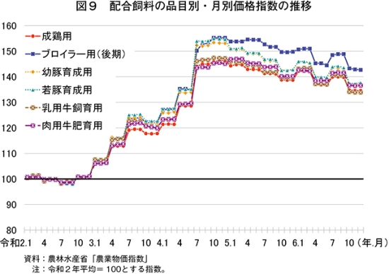 品目別に見ると、いずれもすべての月で100を大幅に上回ったものの、低下傾向にあり、年平均では、成鶏用は同2.5%低下の138.4、ブロイラー用(後期)は同3.7%低下の146.9、幼豚育成用は同3.9%低下の141.4、若豚育成用は同3.9%低下の141.8、乳用牛飼育用は同2.9%低下の138.7、肉用牛肥育用は同3.0%低下の139.8となった(図9)。