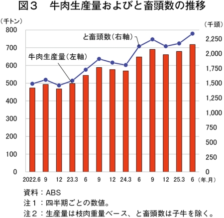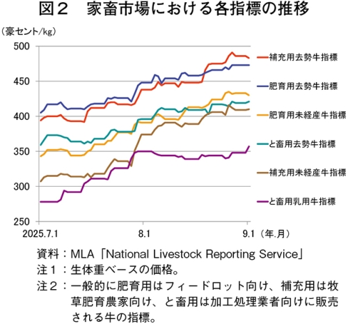 家畜市場における各指標を分析すると、主に農場の繁殖群に導入される雌牛を指す「補充用未経産牛指標」価格が7〜9月にかけて最も伸びており、牛群再構築に伴う繁殖用雌牛の需要増が背景にあるとみられる(図2)。現地報道でも、春の好天に期待する生産者たちが一斉に牛を買い付けているとされている。また、海外市場からの堅調な牛肉需要は継続しており、米国向けの加工用牛肉(90CL:赤身率90%のひき肉)は、8月第3週に1キログラム当たり11.08豪ドル(1086円)と7月に記録した最高値を更新している。