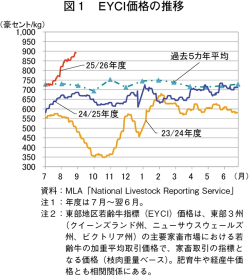 豪州食肉家畜生産者事業団(MLA)によると、肉牛生体取引価格の指標となる東部地区若齢牛指標(EYCI)価格は、7月以降上昇傾向で推移しており、直近8月28日時点では1キログラム当たり891豪セント(873円:1豪ドル=97.98円(注1))と、この1カ月で100セント以上上昇している(図1)。