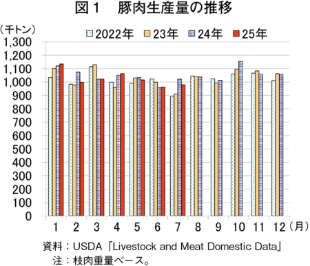 米国農務省全国農業統計局(USDA/NASS)によると、2025年7月の豚と畜頭数は、農場における豚繁殖・呼吸障害症候群(PRRS)の発生件数の増加に伴い、1026万8400頭(前年同月比3.9%減)と前年同月をやや下回った。平均枝肉重量も減少(同0.5%減)したことで、同月の豚肉生産量は97万9100トン(同4.2%減)とやや減少した(図1)。