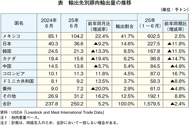 米国農務省経済調査局(USDA/ERS)によると、2025年6月の豚肉輸出量は25万200トン(前年同月比5.2%増)とやや増加した(表)。最大の輸出先となるメキシコ向けは、国内供給を上回る旺盛な需要から10万4200トン(同22.4%増)と大幅に増加した。日本向けは3万6600トン(同9.2%減)とかなりの程度減少した。中国向けは、同国による対米追加関税が一時的に引き下げられた(注3)ことにより、1万3600トン(同5.7%減)とやや減少するにとどまった。25年の輸出量についてUSDAは、316万7000トン(前年比2.0%減)とわずかな減少を見込んでいる。