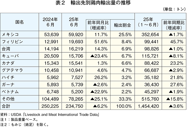 USDA/ERSによると、2025年6月の鶏肉輸出量は23万4750トン(前年同月比6.2%減)とかなりの程度減少し、25年1〜6月累計でも145万4420トン(前年同期比3.6%減)とやや減少した(表2)。地理的優位性から輸出量の約4分の1を占めるメキシコ向けは、ブラジル産の台頭により25年1〜6月累計では35万2654トン(同1.7%減)とわずかに減少した。