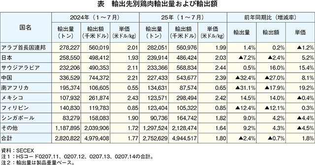 25年1〜7月鶏肉輸出量は前年同期比2.4%減
