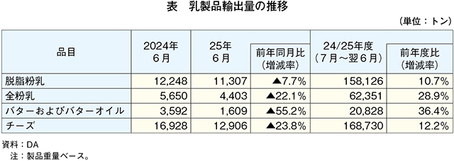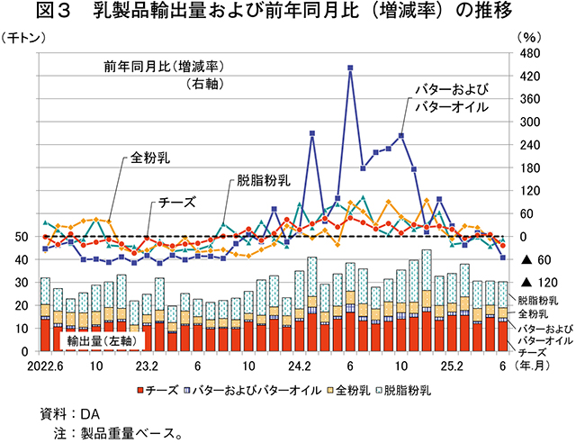 DAが2025年8月に公表した「Dairy Export Summary」によると、25年6月の主要乳製品4品目の輸出量は、いずれも前年同月から減少した。一方、24/25年度の累計輸出量は、同年度上半期(24年7〜12月)の輸出量が多かったことから、いずれも前年度から増加した(表、図3)。