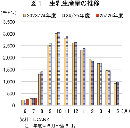 ニュージーランド乳業協会(DCANZ)によると、2025年7月の生乳生産量は31万2000トン(前年同月比0.6%増)とわずかに増加した(図1)。この要因についてニュージーランド証券取引所(NZX)は、NZ乳業大手フォンテラ社が提示した25/26年度(6月〜翌5月)の生産者支払乳価が高い水準であったため、酪農家の生産意欲の向上につながったことを挙げている。