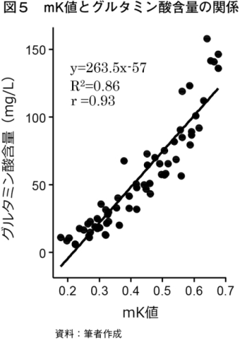 その結果、保存日数が経過するとインピーダンス値比が低下し、mK値およびグルタミン酸含量が増加することが明らかになった。インピーダンス値比の低下は、熟成に伴う細胞膜の劣化やタンパク質の分解によるイオン移動の促進が要因と考えられる。一方、mK値の増加はATP分解過程の進行を反映し、熟成度を示す指標として信頼性が高いことが示唆された。また、グルタミン酸含量の増加はタンパク質分解の進行による遊離アミノ酸の生成が主な要因であり、熟成によるうま味成分の向上を示唆している。さらに、mK値とグルタミン酸含量の間には強い正の相関が認められ、熟成の進行とともに両者が連動して変化することが明確となった。