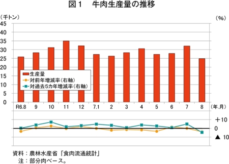 令和7年8月の牛肉生産量(注1)は、2万4893トン(前年同月比3.8%減)と前年同月をやや下回った(図1)。品種別では、和牛は1万2610トン(同0.0%減)と前年同月並み、交雑種は6917トン(同0.7%減)とわずかに、乳用種は5331トン(同14.2%減)とかなり大きく、いずれも前年同月を下回った。