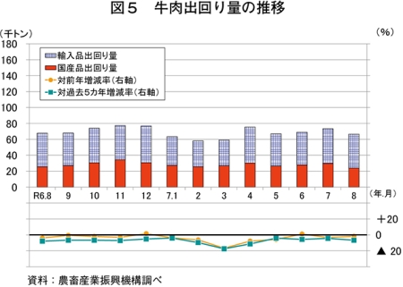 推定出回り量は、6万6537トン(同1.8%減)と前年同月をわずかに下回った(図5)。このうち、国産品は2万3884トン(同6.1%減)と前年同月をかなりの程度下回った一方、輸入品は4万2653トン(同0.7%増)と前年同月をわずかに上回った。
