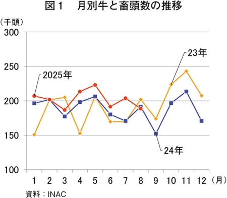 ウルグアイ食肉協会(INAC)によると、2025年1〜8月の牛と畜頭数は161万7000頭(前年同期比6.2%増)と前年同期をかなりの程度上回った(図1)。米国農務省(USDA)によると、堅調な外需に加え、同国内で肥育牛に穀物を与えるケースが増加していることで増体効率が向上し、と畜月齢が早期化していることが一因とされている。