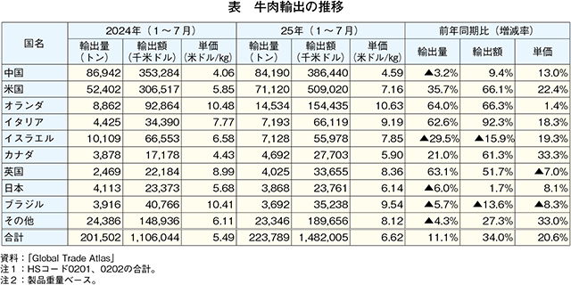 2025年1〜7月の牛肉輸出量は、22万3789トン(前年同期比11.1%増)と前年同期をかなり大きく上回った(表)。また、牛肉価格は1キログラム当たり6.62米ドル(992円、同20.6%高)と前年同期を大幅に上回った。USDAは、輸出量の増加および価格の上昇により、25年の輸出額は過去最高を記録すると予測している。