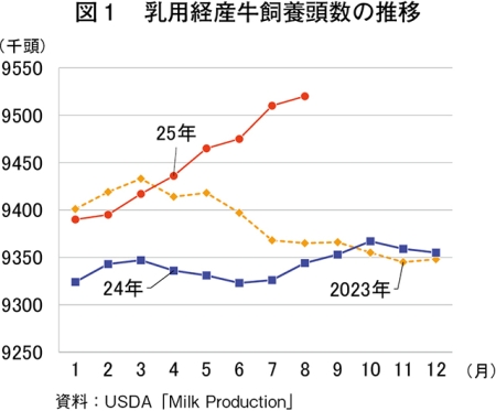 米国農務省全国農業統計局(USDA/NASS)によると、2025年8月の乳用経産牛飼養頭数は952万頭(前年同月比1.9%増)とわずかに増加した(図1)。これは、乳価が堅調に推移していることや、後継牛価格の上昇により乳牛群の更新が難しい中、乳用経産牛を保留する傾向が強まっていることが要因とされている。同月の生乳生産量は、乳用経産牛飼養頭数および1頭当たり乳量(同1.4%増)の増加により、885万4000トン(同3.2%増)とやや増加した(図2)。