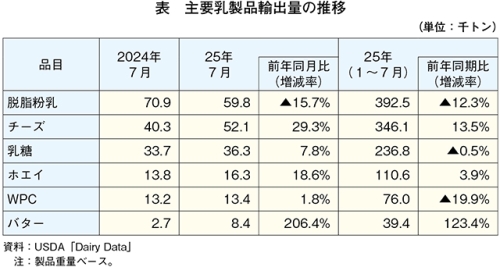 25年7月の乳製品輸出量、脱脂粉乳は減少もチーズやバターは増加