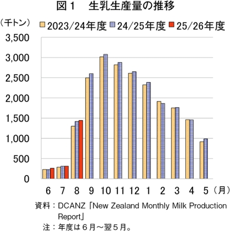 ニュージーランド乳業協会(DCANZ)によると、2025年8月の生乳生産量は144万4000トン(前年同月比1.8%増)とわずかに増加し、8月単月の生産量としては20年以降で最大となった(図1)。この要因についてニュージーランド証券取引所(NZX)は、肥料などの生産コストが上昇しているものの、1)良好な放牧環境、2)比較的安価な飼料価格、3)高い水準にある25/26年度(6月〜翌5月)の生産者支払乳価−などが、酪農家の生産意欲の向上につながったことを挙げている。