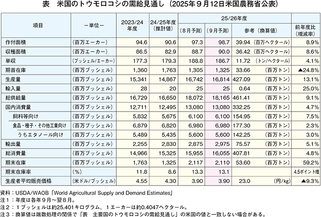 米国農務省世界農業観測ボード(USDA/WAOB)は2025年9月12日、25/26年度(9月〜翌8月)の米国のトウモロコシ需給見通しを公表した(表)。