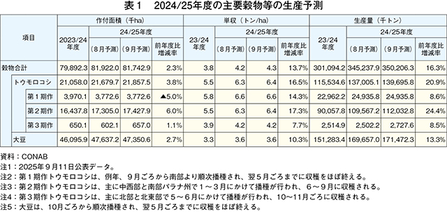 ブラジル国家食糧供給公社(CONAB)は2025年9月11日、24/25年度第12回目となる主要穀物の生産状況等調査結果を公表した。この調査は、春植えの夏期作物(大豆、第1期作トウモロコシなど)や秋植えの冬期作物(第2期作・第3期作トウモロコシ、小麦、大麦、ライ麦など)の生産予測を毎月公表するものである。