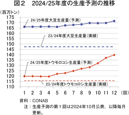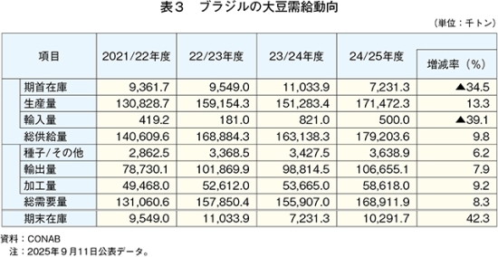 今回の調査で、CONABが大豆の作付面積と単収について見直しを行ったため、20/21年度から24/25年度の生産量が調整されている。また、併せて期末在庫もブラジル地理統計院(IBGE)が公表した数値に基づき調整されている。