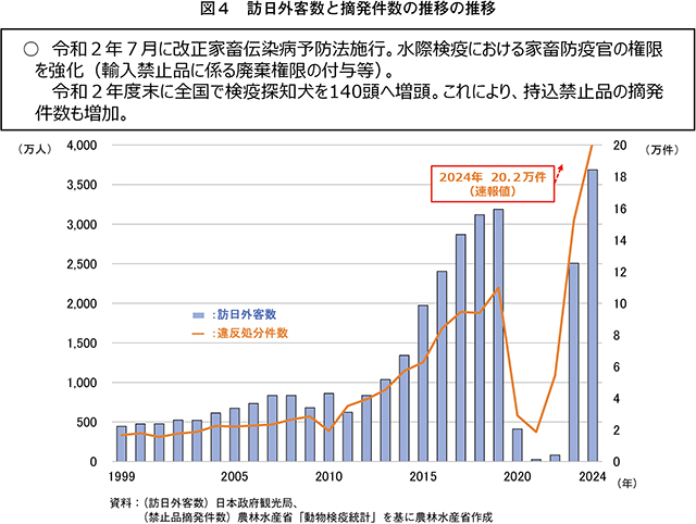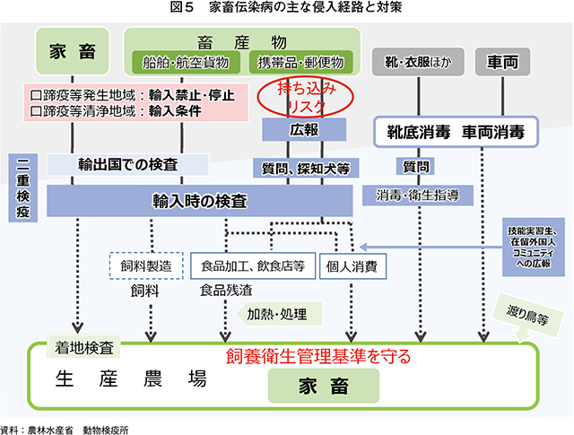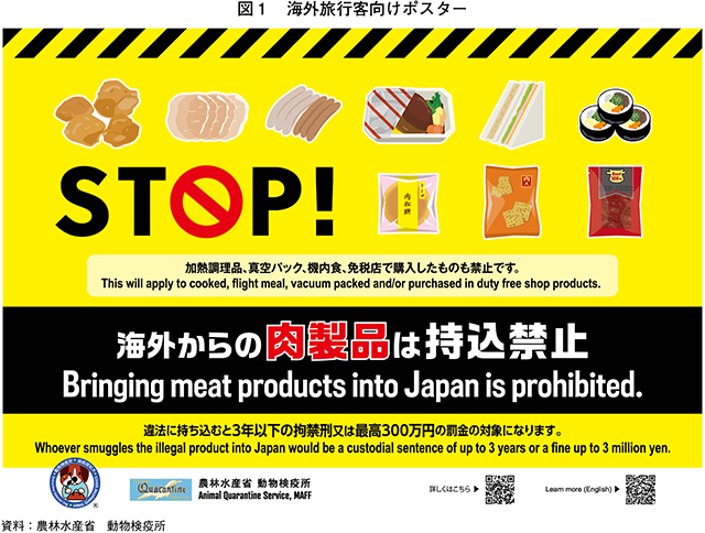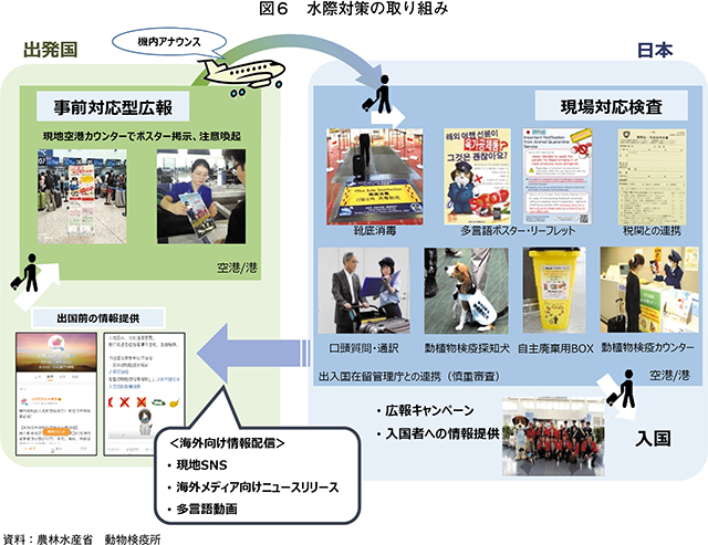 家畜伝染病の侵入防止には、わが国へ輸入できない畜産物の持ち込みを、輸出される前に未然に防ぐことが最も有効であることから、動物検疫所は海外への事前対応型広報を戦略的に展開している。具体的には、中国やベトナムなど違法持ち込みが多い国を対象に、1)ソーシャル・ネットワーキング・サービス(SNS) や海外メディア向けのニュースリリースでの情報発信、2)多言語動画による動物検疫制度の配信、3)航空会社に依頼して現地の空港カウンターでのポスターやリーフレットの掲示と機内アナウンスによる注意喚起−などを行っている。