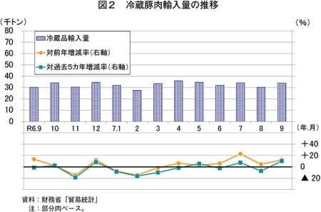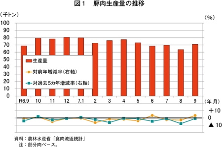 令和7年9月の豚肉生産量は、7万991トン(前年同月比3.3%増)と前年同月をやや上回った(図1)。