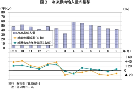 9月の輸入量について、冷蔵品は、米国産の価格が高水準にある中、カナダ産が増加したことなどから、3万4042トン(前年同月比12.4%増)と前年同月をかなり大きく上回った(図2)。冷凍品は、国内の輸入品在庫が多いことなどから、4万2155トン(同12.9%減)と前年同月をかなり大きく下回った(図3)。この結果、輸入量の合計(注1)では、7万6220トン(同3.1%減)と前年同月をやや下回った。