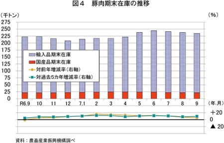 9月の推定期末在庫は、23万4720トン(前年同月比5.4%増)と前年同月をやや上回った(図4)。このうち、輸入品は、21万3175トン(同6.0%増)と前年同月をかなりの程度上回った。