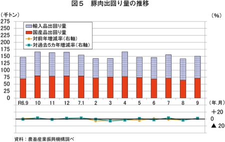 推定出回り量は、15万356トン(同2.3%増)と前年同月をわずかに上回った(図5)。このうち、国産品は7万1134トン(同2.8%増)、輸入品は7万9223トン(同1.9%増)と、ともに前年同月をわずかに上回った。