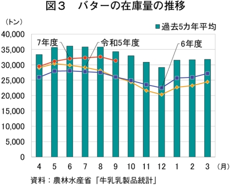 9月のバターの生産量は4478トン(前年同月比7.5%増)と、前年同月をかなりの程度上回り、7カ月連続で上回った(図2)。一方、出回り量は6345トン(同0.4%減)と4カ月連続で前年同月を下回った(農畜産業振興機構調べ)。在庫量については、9月末は3万1336トン(同20.4%増)となり、13カ月連続で前年同月を上回ったが、前月と比べると季節的な動向により減少した(図3)。