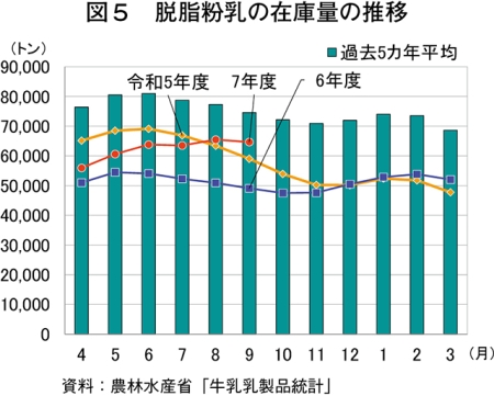9月の脱脂粉乳の生産量は、9845トン(前年同月比3.9%増)と前年同月をやや上回り、7カ月連続で上回った(図4)。一方、出回り量は1万664トン(同6.2%減)とかなりの程度下回り、8カ月連続で下回った(農畜産業振興機構調べ)。9月末の在庫量は、6万4662トン(同31.7%増)と前年同月を大幅に上回り、10カ月連続で上回った。(図5)。