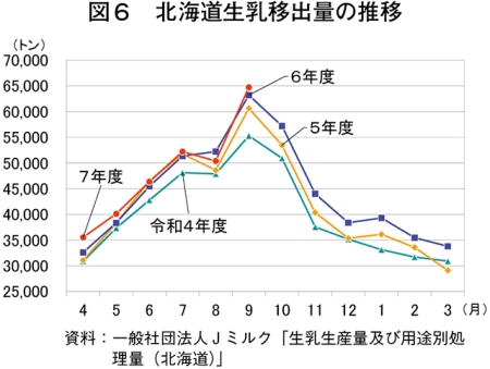 9月は例年、学校給食が再開するなど需要が増加する一方で、夏場の暑さなどにより都府県の生乳生産量が落ち込むことから、生乳の道外移出量が最も多くなる。令和7年9月の生乳の道外移出量は、6万4723トン(前年同月比2.4%増)と2カ月ぶりに前年同月を上回った(図6)。