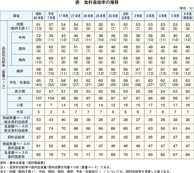 (注1)「食料需給表」とは、1年間に国内で供給される食料の生産から最終消費に至るまでの総量を明らかにするとともに、国民1人当たりの供給純食料および栄養量を示したものであり、食料自給率の算出の基礎となるものである。計測期間は、牛肉、豚肉、牛乳・乳製品、鶏卵については、当年4月1日から翌年3月31日まで、鶏肉については、平成21年度以降、暦年(当年1月1日から12月31日まで)となっている。