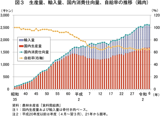 令和6年の鶏肉自給率、前年から1ポイント低下の64%