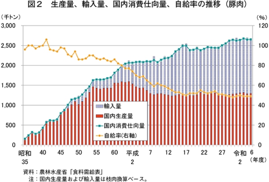 令和6年度の豚肉自給率、前年度から1ポイント低下の48%