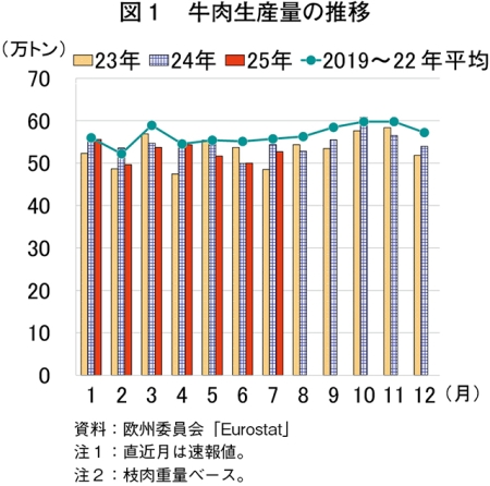 欧州委員会によると、2025年7月の牛肉生産量(EU27カ国)は52万6880トン(前年同月比3.1%減)とやや減少した(図1)。これは、飼料価格の下落と牛肉価格の高騰による肥育期間の長期化の傾向から、1頭当たり枝肉重量が300.1キログラム(同1.5%増)とわずかに増加したものの、飼養頭数の減少や高乳価を背景とした一時的な搾乳牛の更新時期の延長により、と畜頭数が175万5740頭(同4.5%減)とやや減少したことが影響した。また、同年1〜7月の累計牛肉生産量は367万5870トン(前年同期比3.0%減)と前年同期をやや下回った。