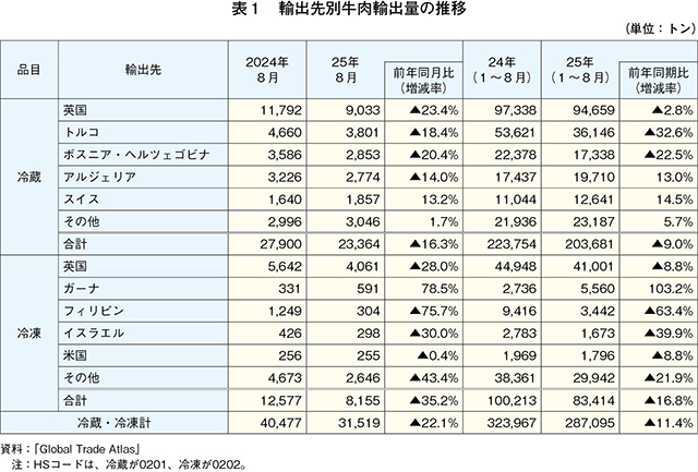 2025年1〜8月の牛肉輸出量は、28万7095トン(前年同期比11.4%減)とかなり大きく減少した(表1)。域内の牛肉価格が高値で推移していることから、冷蔵牛肉の輸出量は同9.0%減、冷凍牛肉の輸出量は同16.8%減となった。